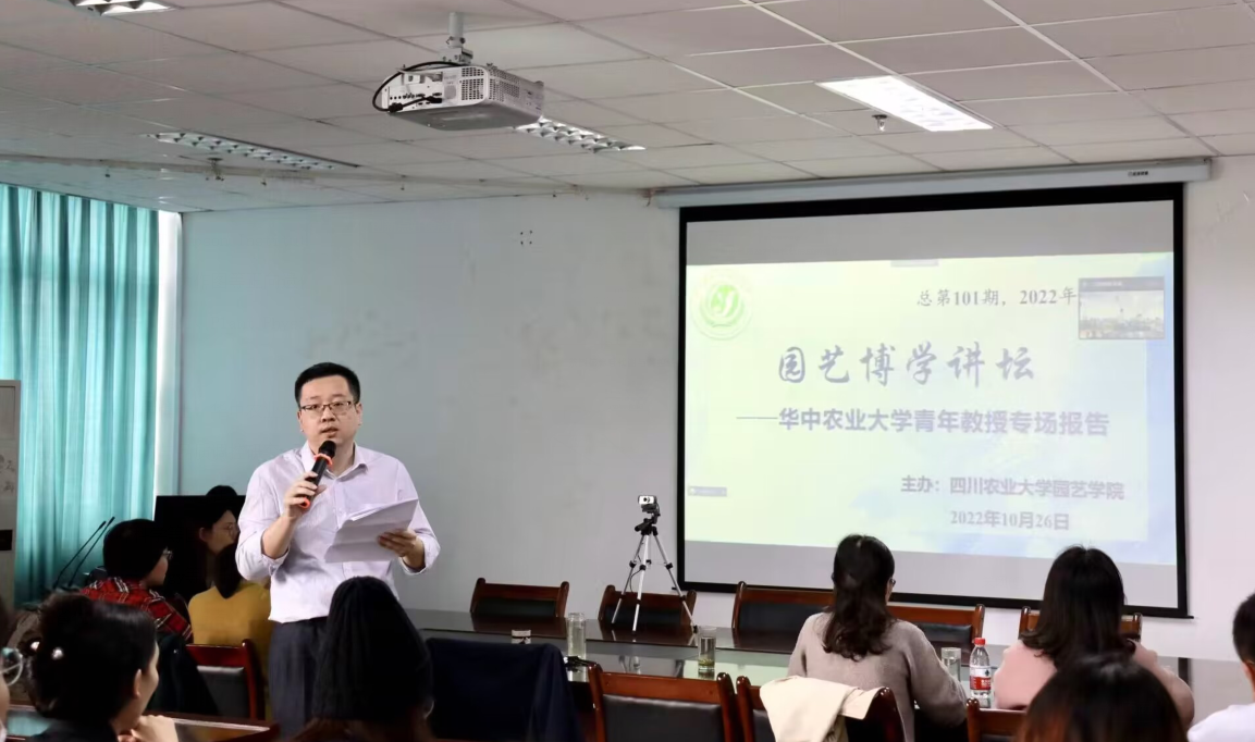 园艺博学讲坛总第101期,2022年第8期华中农业大学青年教授专场报告10月26日下午通过线上和线下相结合的方式开讲。华中农业大学园艺林学学院朱峰研究员、叶杰副教授和郭飞副教授受邀担任主讲人。学院200余名师生聆听报告。