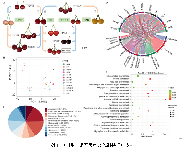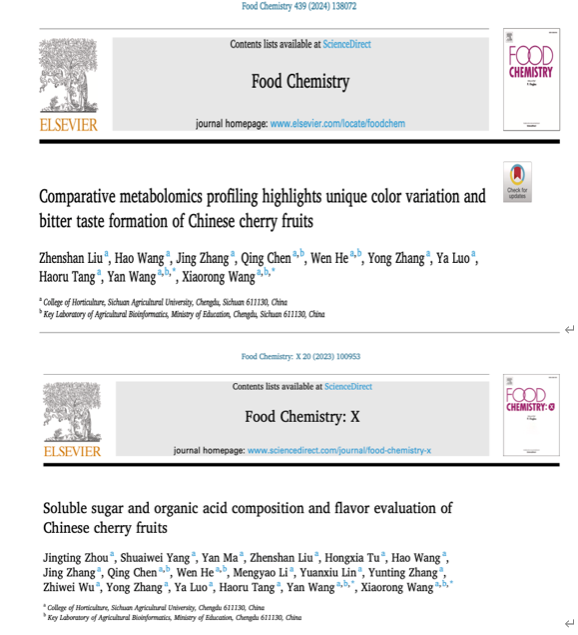 近日,学院果树学系果树种质创新与遗传改良团队在中科院大类一区TOP期刊《Food Chemistry》(IF=8.8)和《Food Chemistry: X》(IF=6.1)上发表了题为“Comparative metabolomics profiling highlights unique color variation and bitter taste formation of Chinese cherry fruits(代谢组学比较分析解析中国樱桃独特的色泽变异和苦味形成)”和“Soluble sugar and organic acid composition and flavor evaluation of Chinese cherry fruits(中国樱桃果实糖酸组成及风味评价)”的研究论文。