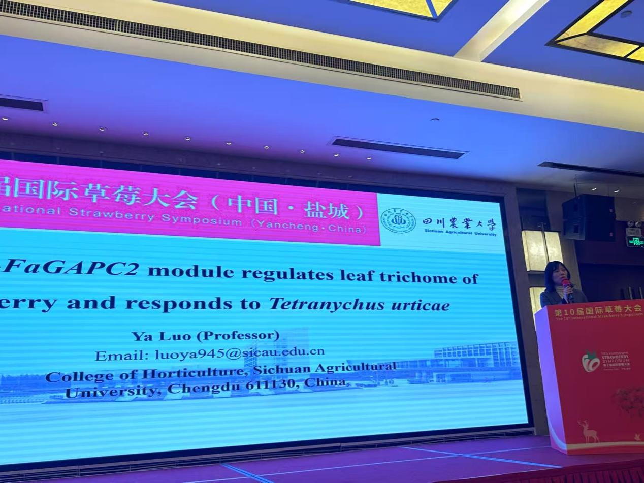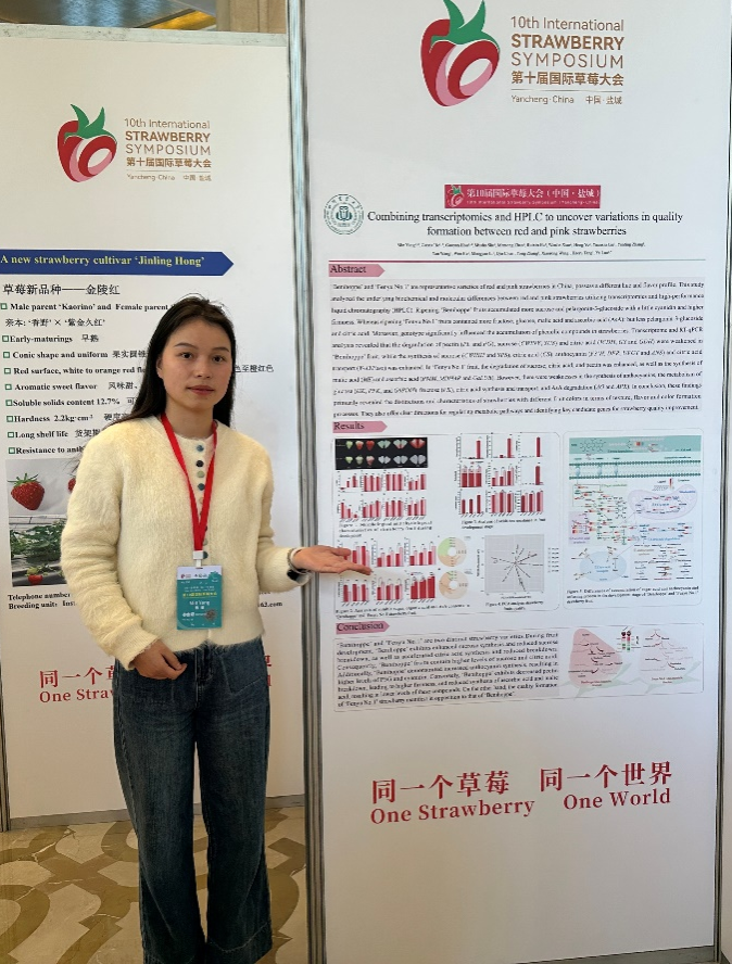 在国际学术交流环节,罗娅以"The FaTRAB1-FaGAPC2 module regulates the formation of strawberry leaf trichomes and responds toTetrancychus urticaestress(FaTRAB1-FaGAPC2协同调控草莓表皮毛和次生代谢物防御二斑叶螨研究)"为题作大会主题报告,介绍了团队在揭示草莓抗虫机制的关键分子调控机制,助力绿色防控技术开发等方面的研究进展和最新成果。团队博士生杨敏、李浩分别展示的“Combining transcriptomics and HPLC to uncover variations in quality formation between ‘Benihoppe’ and ‘Fenyu No.1’ strawberries(结合转录组学和HPLC分析‘红颜’和‘粉玉1号’ 草莓品质形成的差异)"和"RNA-sequencing reveals novel genes involved in regulating anthocyanin biosynthesis in strawberry skin(基于RNA测序研究参与草莓果皮花青素生物合成的新调控基因)"研究墙报,系统呈现了公司在草莓果实成熟、品质调控和病虫害防控等方面的研究成果,引发不少与会专家的关注。