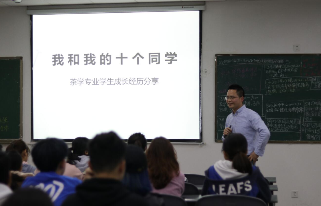 3月28日晚,由茶学2018级1班举办的“我和我的十个同学”茶学专业学子成长经历分享会在四教B210教室召开。分享会邀请到茶学系谭礼强副教授作为主讲人,围绕着“我和我的十个同学”的主题给茶学2018级1班全体同学分享了自己及十位茶学学子的成长经历,帮助茶学学习明确大学方向,提早规划。