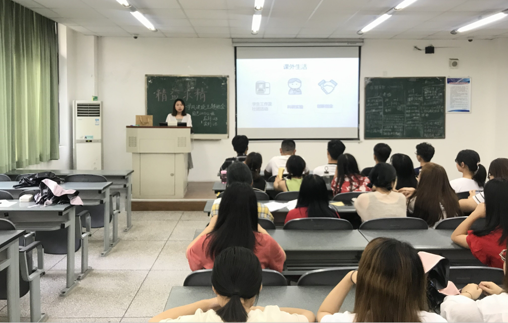 曾任学院员工会副主席的夏炀,以幽默风趣的语言将小班同学带入他的学习经历、各类创新比赛以及社会实践当中。他认为:走出去非常重要、也十分必要,无论是学习、比赛还是社会实践都不应局限于自己身边这个小圈子,多走出去开阔自己的眼界,方能抓住更多机会发展自己。2018-2019学年加权平均成绩专业第一的张慧艺,从课程学习和课外生活两个方面进行了分享,她说:“大学不是用来玩的,而是用来学习各种知识和技能的过程”。她希望大家上课时坐在教室的最前面,能集中自己的精神,听懂老师的问题,高效率的运用课堂时间;在期末复习时,提前一个月或一个半月安排自己的复习计划,有条不紊地进行复习。留任学习部的她深知员工工作经历对自身能力提升的帮助,她强调工作在精不在多,鼓励大家积极参加员工工作,扩展自己的爱好,锻炼提升学习、工作能力。