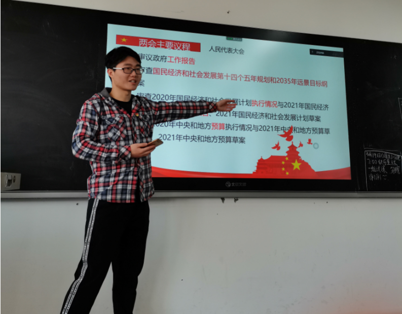 胡继勋同志向大家介绍了今年“两会”会议相关情况和研究的具体内容,进一步加深大家对“两会”知识的理解。随后,他分别对“中华人民共和国第十三届全国人民代表大会第四次会议”和“中国人民政治协商会议第十三届全国委员会第四次会议”两个会议内容结合自身掌握的知识辅以列表的形式同大家进行分享。用“远景目标”、“新发展格局”、“科技创新”、“乡村振兴”、“减税降费”、“高水平对外开放”、“民生保障”、“绿色转型”八个关键词,聚焦此次本次会议主要内容。对“乡村振兴”内容,他谈到,作为农业院校学子,所学专业具有与乡村产业振兴结合紧密的特点,要努力学习,努力在乡村振兴中贡献青春智慧。学习会上,其他同志们结合掌握的知识,从自身如何匹配要求出发纷纷发表看法,思考在新时代,作为“新农人”如何在机遇与挑战中奋进。