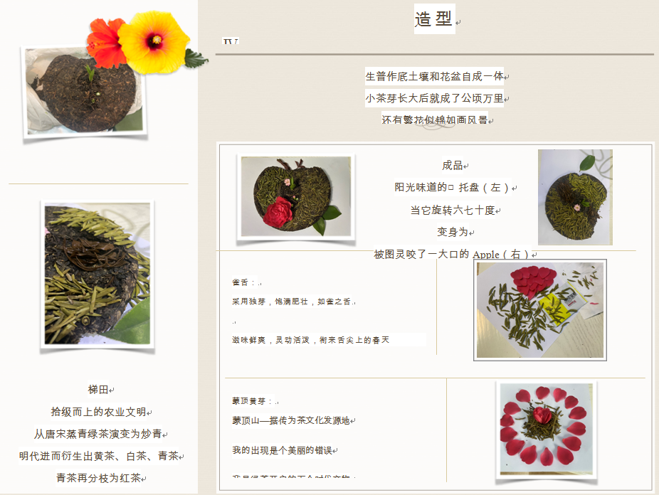 “守护人”们用自己的语言为心仪之茶代言,图文并茂讲述茶的历史、由来、特色以及与茶的羁绊、故事等。而后以所选之茶叶为原料制作手工茶制品,且将制作流程以手账、视频、PPT等形式记录和展示。活动中,同学们对作品赞叹有加,不少同学都纷纷表示:“原来茶叶不仅有如此丰富的历史故事和文化内涵,还可以进行这么多种类的二次创作,思路新颖令我受益匪浅。”