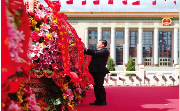 2018年9月30日上午,党和国家领导人习近平、李克强、栗战书、汪洋、王沪宁、赵乐际、韩正、王岐山等来到北京天安门广场,出席烈士纪念日向人民英雄敬献花篮仪式。这是习近平整理花篮上的缎带。 新华社记者 谢环驰/摄