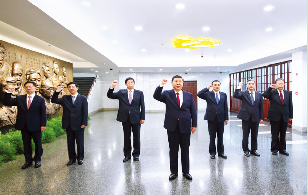 2017年10月31日,中共中央总书记、国家主席、中央军委主席习近平带领中共中央政治局常委李克强、栗战书、汪洋、王沪宁、赵乐际、韩正,瞻仰上海中共一大会址和浙江嘉兴南湖红船。这是31日上午,在上海中共一大会址纪念馆,习近平带领其他中共中央政治局常委同志一起重温入党誓词。 新华社记者 兰红光/摄