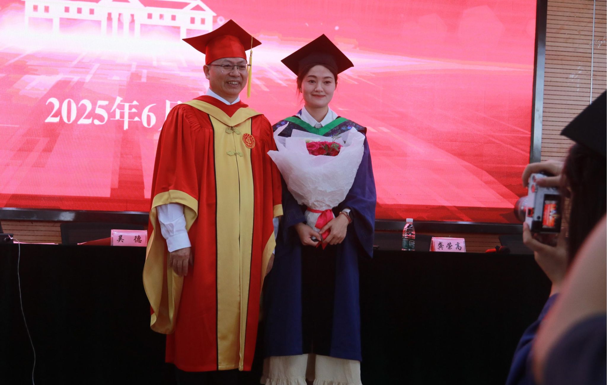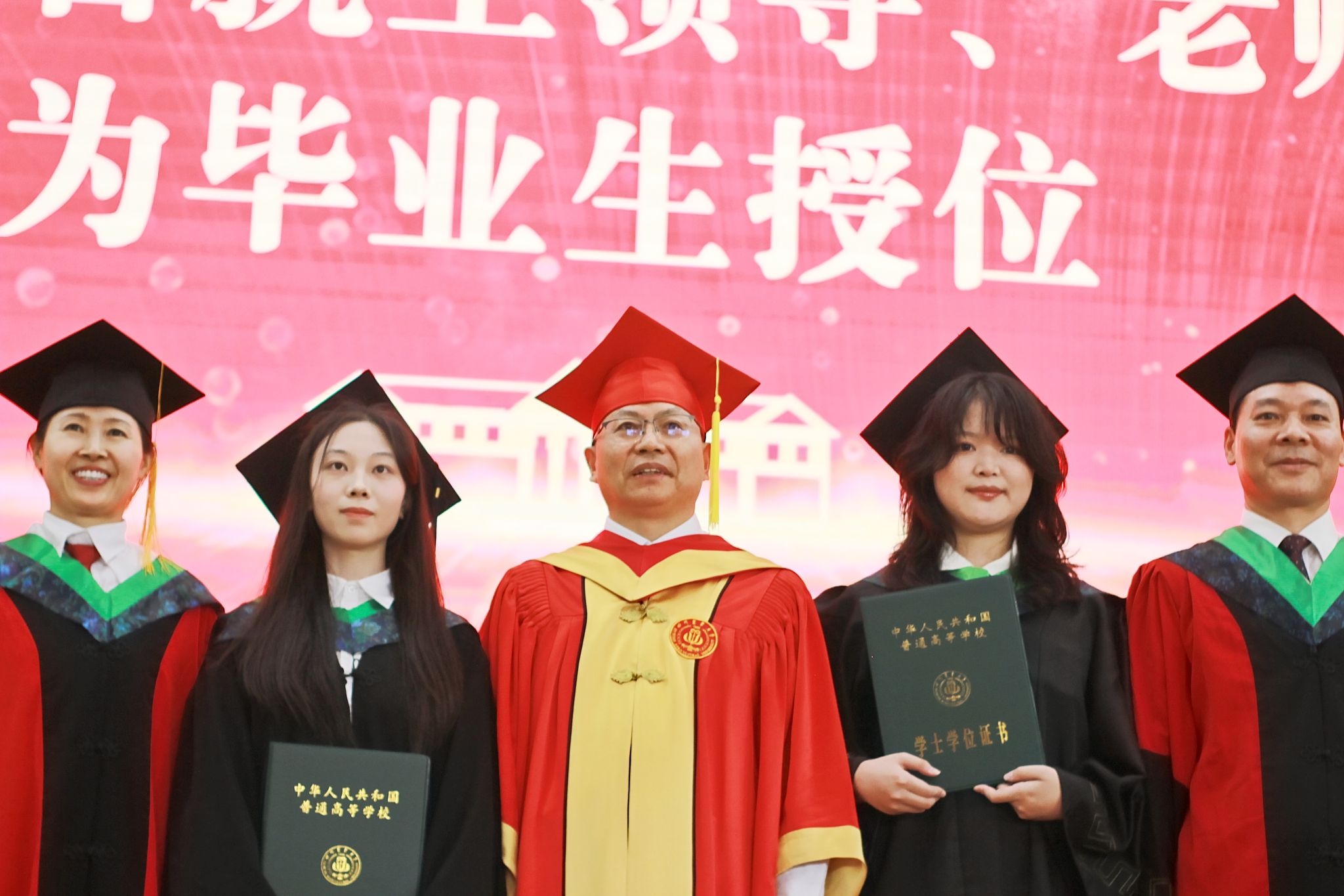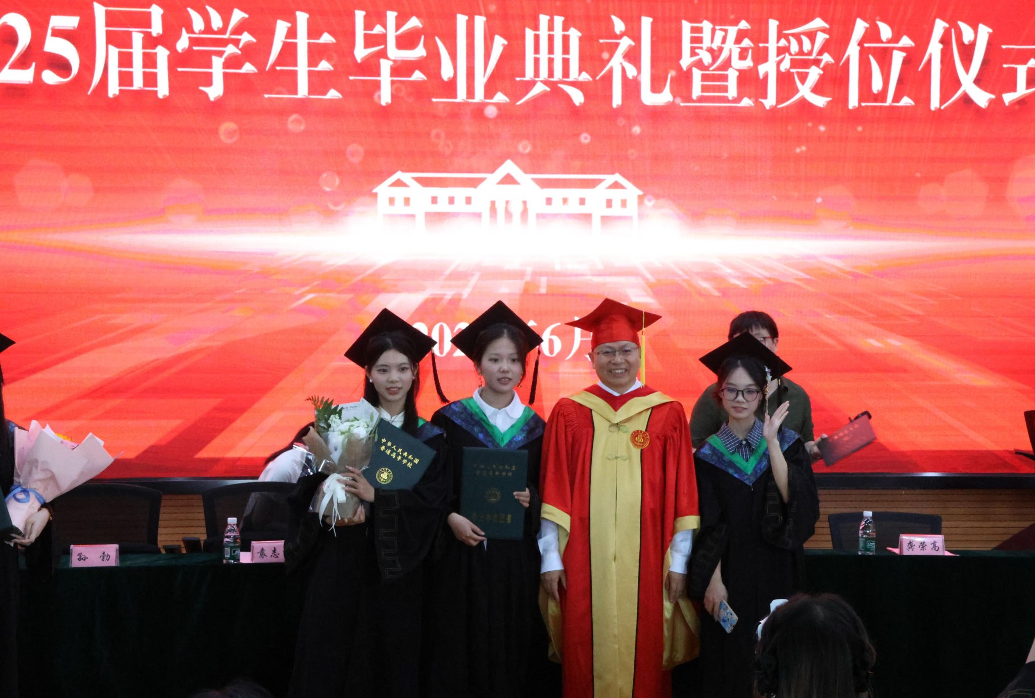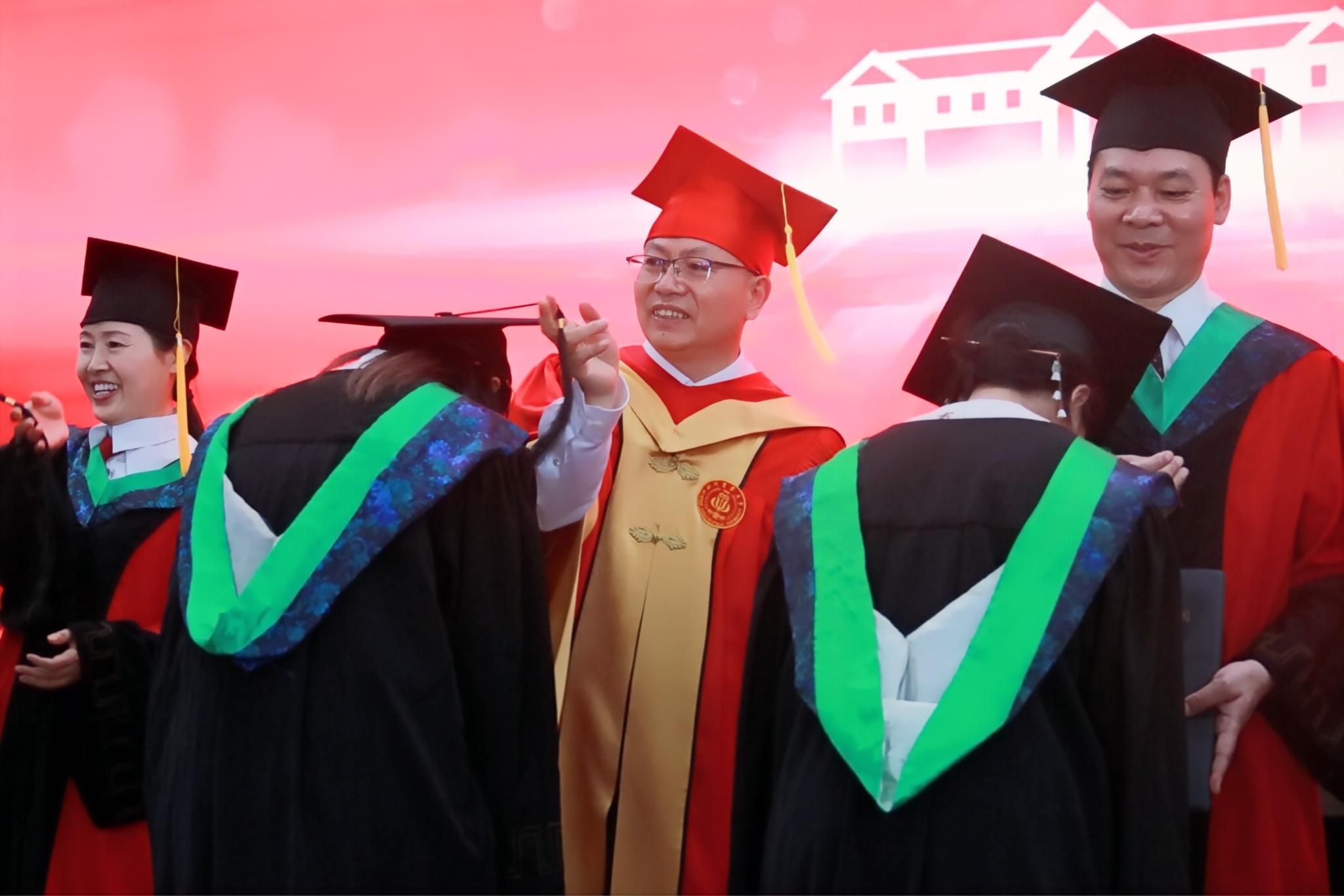董事长吴德教授宣读授位决定后,在孙勃的名单宣读和引导下,98名硕士研究生、239名本科生在《相聚在桂花飘香的时节》的校歌声中依次上台,接受拨穗正冠和授位,毕业生向授位老师鞠躬致谢并合影留念,此次大会为毕业生们这一阶段的拼搏奋斗画上了圆满的句号,也开启了他们人生的新篇章。