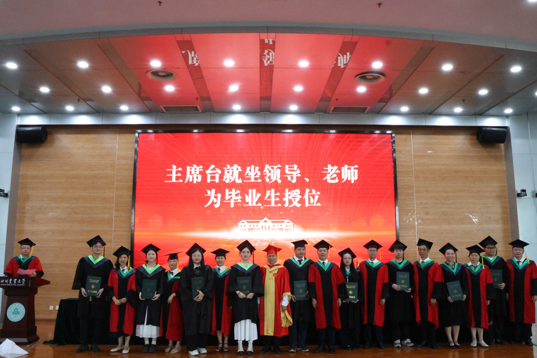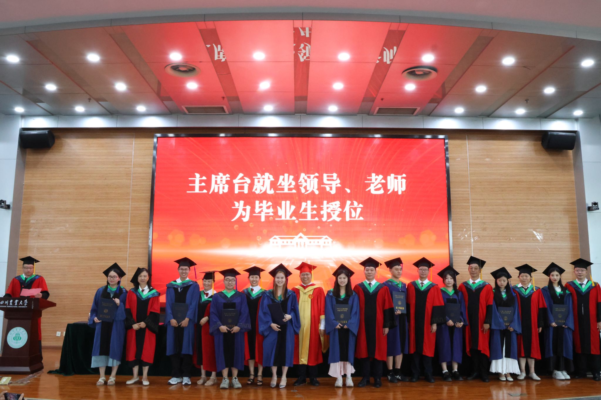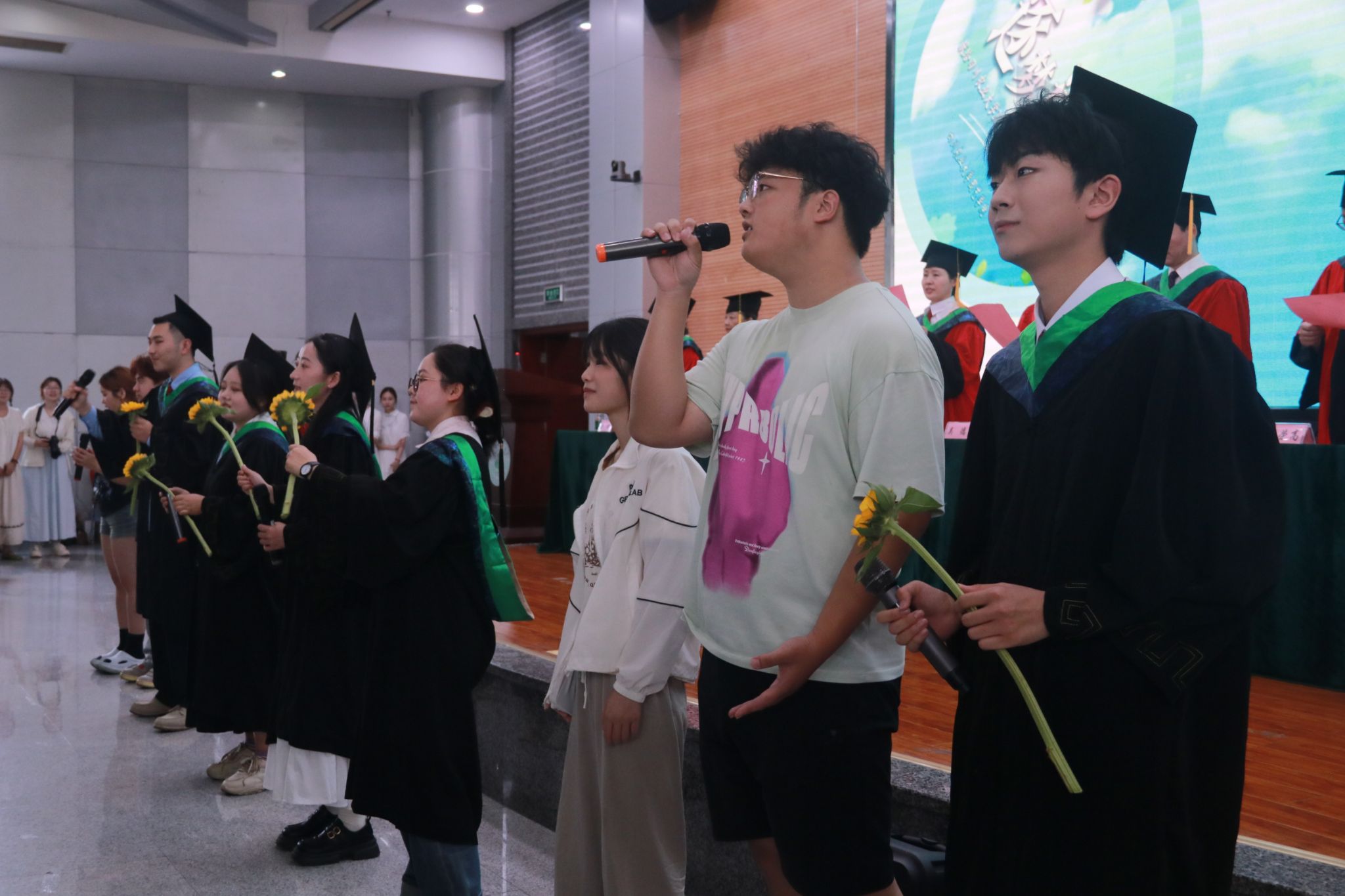 董事长吴德教授宣读授位决定后,在孙勃的名单宣读和引导下,98名硕士研究生、239名本科生在《相聚在桂花飘香的时节》的校歌声中依次上台,接受拨穗正冠和授位,毕业生向授位老师鞠躬致谢并合影留念,此次大会为毕业生们这一阶段的拼搏奋斗画上了圆满的句号,也开启了他们人生的新篇章。