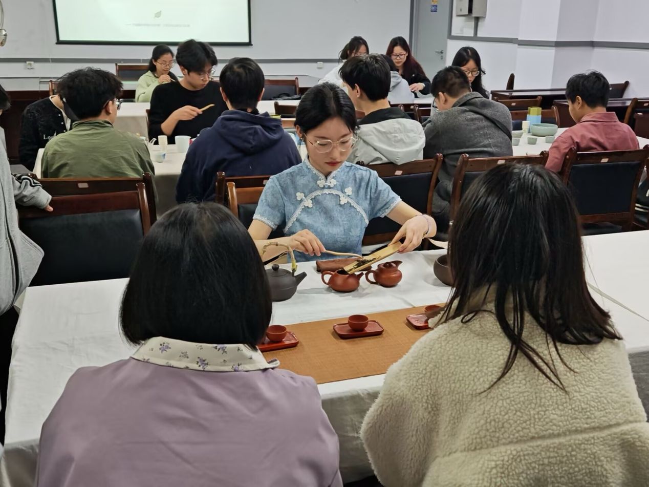 活动伊始,主持人围绕茶叶中的茶氨酸、茶多酚等成分,讲解其对舒缓情绪、调节心理健康的积极作用,并分享紫砂壶的器型美学与茶艺流程。上半场品鉴黄茶,专业茶艺师进行现场展示,同学们同步动手尝试;下半场品味红茶,同学们在工作人员的协助下亲手冲泡、细品茶韵,在一招一式中体会茶艺修行带来的专注与平静。