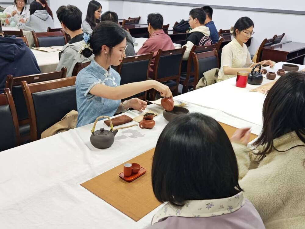 活动伊始,主持人围绕茶叶中的茶氨酸、茶多酚等成分,讲解其对舒缓情绪、调节心理健康的积极作用,并分享紫砂壶的器型美学与茶艺流程。上半场品鉴黄茶,专业茶艺师进行现场展示,同学们同步动手尝试;下半场品味红茶,同学们在工作人员的协助下亲手冲泡、细品茶韵,在一招一式中体会茶艺修行带来的专注与平静。
