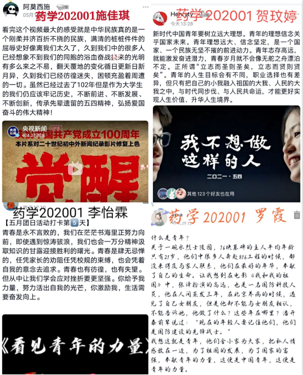 活动邀请本年度获得学校“十佳优秀五四红旗标兵”团支部书记李艳文进行成长分享。她介绍如何传承五四精神,通过学、思、感、动做好团支部建设工作和团员思想引领,进一步加强团支部团结凝聚力和战斗力。环境工程2001和药学2001的团员代表周芊蔚和喻超分享自己对新时代五四精神的理解以及自己如何将五四精神用于实际学习与日常生活中的心得。