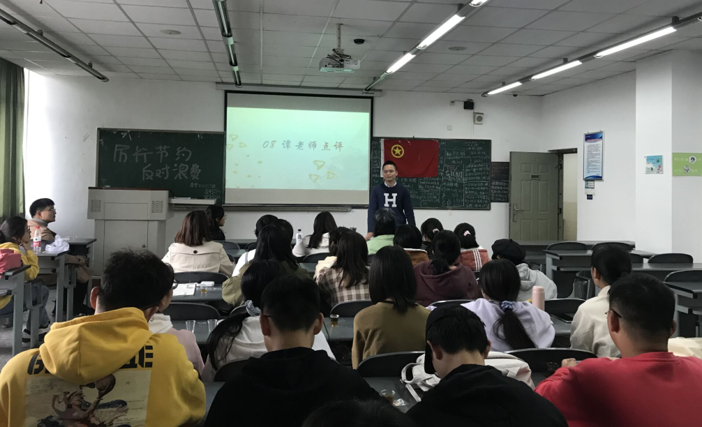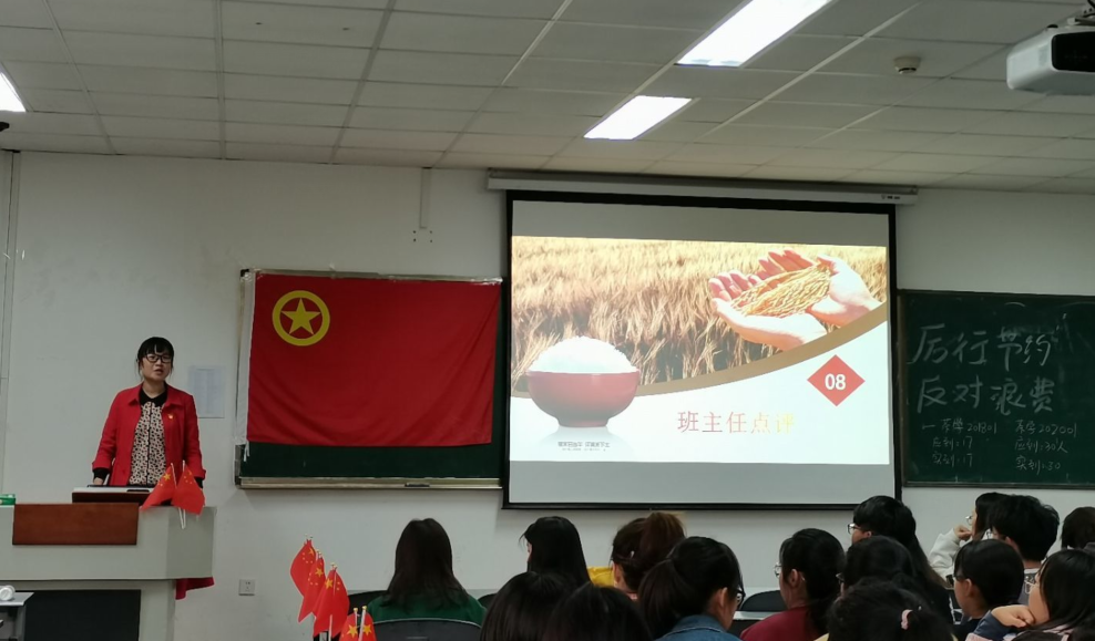 茶学201803的班主任边金霖最从茶文化出发,引用《茶经》中陆纳杖侄的典故,鼓励同学们生活要勤俭节约,不要奢靡浪费,深刻践行“厉行节约,反对浪费”,从身边的小事做起,成为一个有担当、有责任的新时代青年。