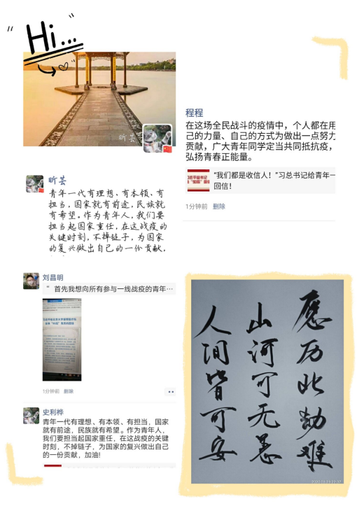 会上,团支书刘昌明带领同学们对习近平总书记15日给北京大学援鄂医疗队“90后”党员的回信进行学习,同学们也都借助微信、QQ等网络载体进行评论和转发。通过行动,切实把共青团的组织力、引领力、服务力体现到大局贡献度上,为打赢疫情防控阻击战贡献青春力量。