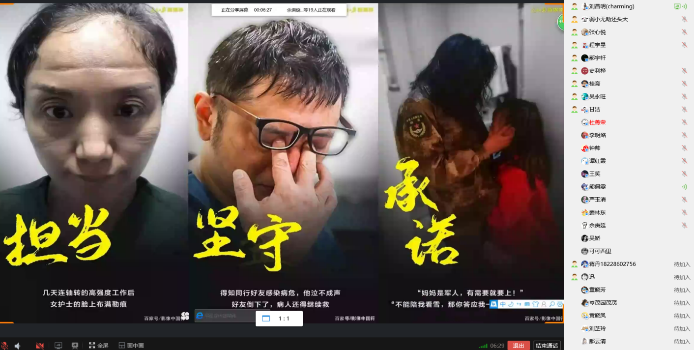 接着进行了《战役日记》和川农艺术团的抗疫视频分享,每一个画面,每一次呼吸,每一次感叹都跟随着视频中的一线工作者共鸣。“我不是第一次看这个视频,但我每次观看都有不一样的感受,也许我们现在不能和他们一样奔赴前线,但我们可以以他们为榜样,为之努力和奋斗”,同学们分享感悟到。