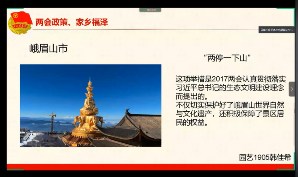 齐唱团歌之后,主持人播放了与“两会”相关的短视频,从各个方面介绍了两会内容。随后的游戏互动环节,同学们积极回答主持人所提的有关两会问题,线上热情高涨。游戏后,共同探讨两会政策和家乡福泽,有三位同学分别来分享两会政策给自己家乡带来的变化,深刻诠释了国家政策给国民生活带来的福利和变化。