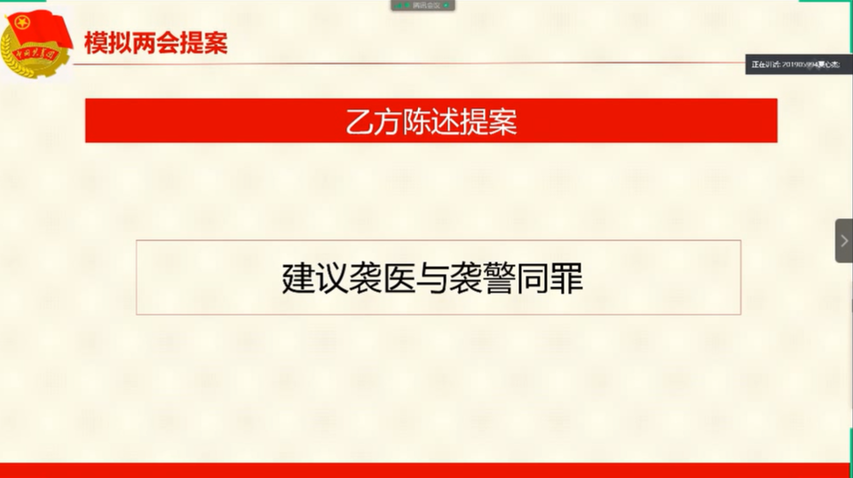 最后环节是模拟“两会”提案,由甲、乙两组同学模拟两会提案场景,分别阐述本组的提案及观点,阐述完毕后,进入同学代表提问环节,有同学针对甲方“关于婚姻过错方少分或不分财产的建议”的提案提出:“如果妻子因遭受家暴而出轨该如何定义过错方”的问题,双方就此产生激烈的讨论,最终决定以“将两件事分开进行责任认定,各自承担自身责任”的办法解决。通过投票,甲组同学胜出。