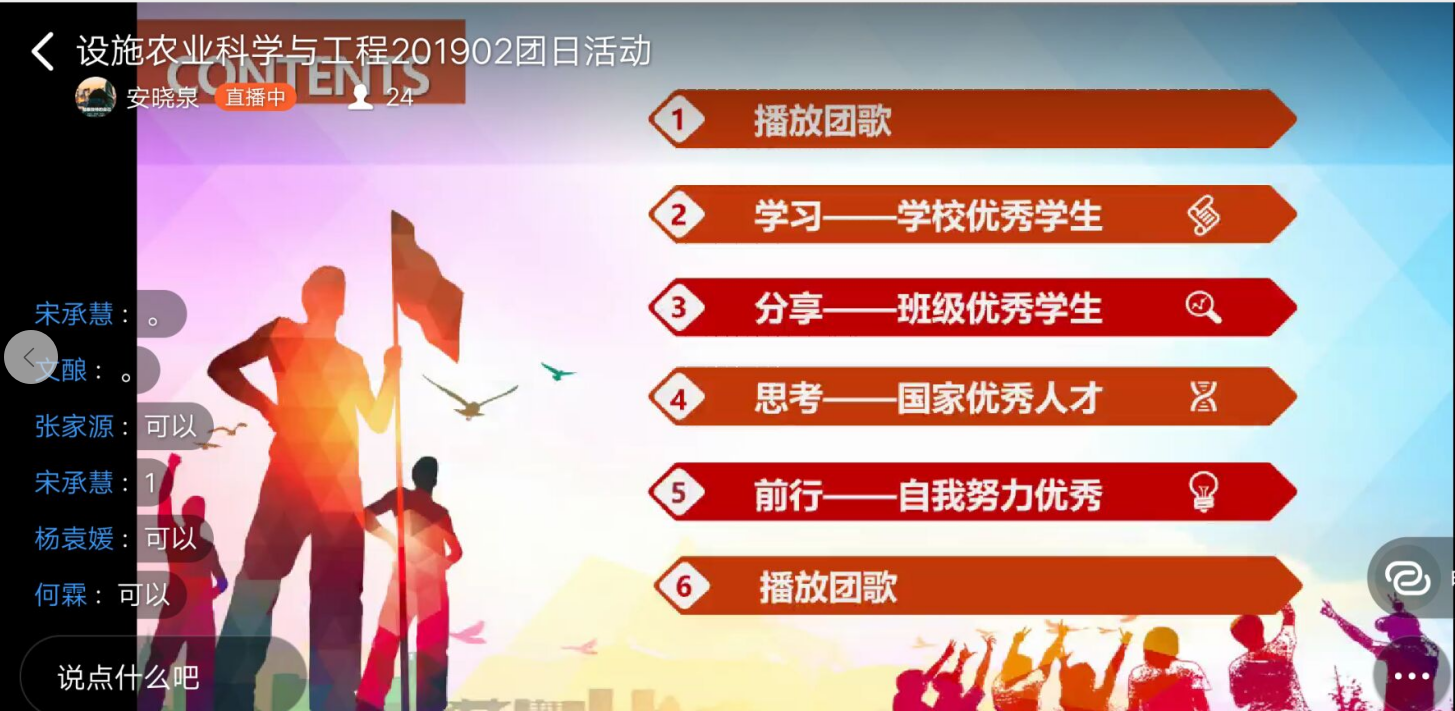4月18日,设施农业科学与工程专业201902团支部在线开展了“青春飞扬,前行力量”主题团日活动。活动融合了多种形式,由为期一周的英语打卡活动、校优秀员工事迹的分享、大家说梦想,畅未来等。