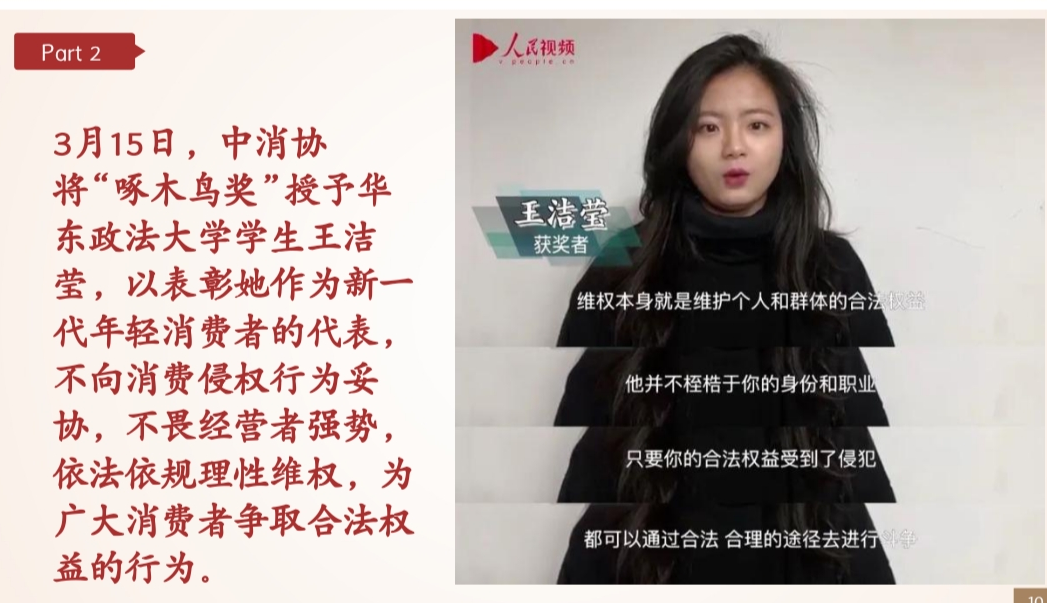 会上,大家共同学习了3月15日习近平总书记致北京大学援鄂医疗队全体“90后”党员的一封信内容。从“广大青年用行动证明,新时代的中国青年是好样的,是堪当大任的”、“青年一代有理想、有本领、有担当,国家就有前途,民族就有希望”等总书记对中国新青年的期许话语中发表感想。期间,大家还聚焦时事,了解3月15日华东政法大学员工王洁莹被授予“啄木鸟奖”事件,学习她作为新一代年轻消费者的代表,不向消费侵权行为妥协、不畏经营者强势、依法依规理性维权、为广大消费者争取合法权益的精神。