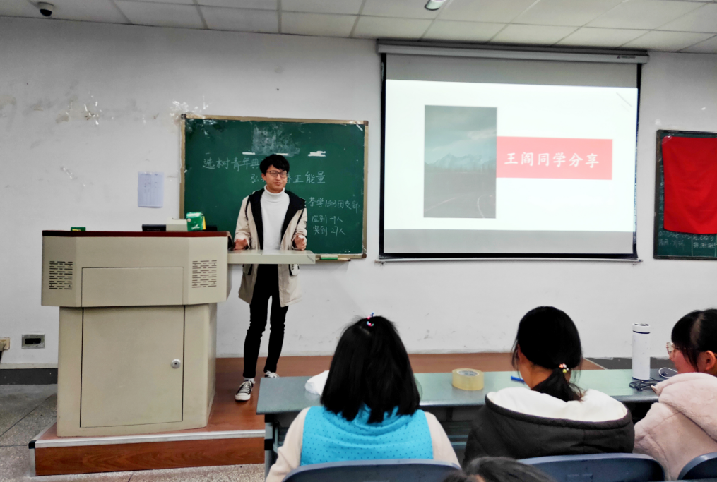 齐唱团歌,活动开始。以韩国男团BTS ,花样滑冰运动员羽生结弦,哈弗研究生优秀毕业生发言人何江,Nature年度十大科学人物曹原为代表介绍海内外优秀青年代表及其事迹。优秀标兵从身边看齐,就文体学习,员工工作,志愿服务等各方面优秀班级同学分享经验和感悟,其中胡畔在大二学期室友的鼓励下重拾遗忘多年的小提琴并成功通过选拔进入校交响乐团并完成了首场专场演出,她分享到,要敢于突破,敢于尝试,一切都为时不晚。