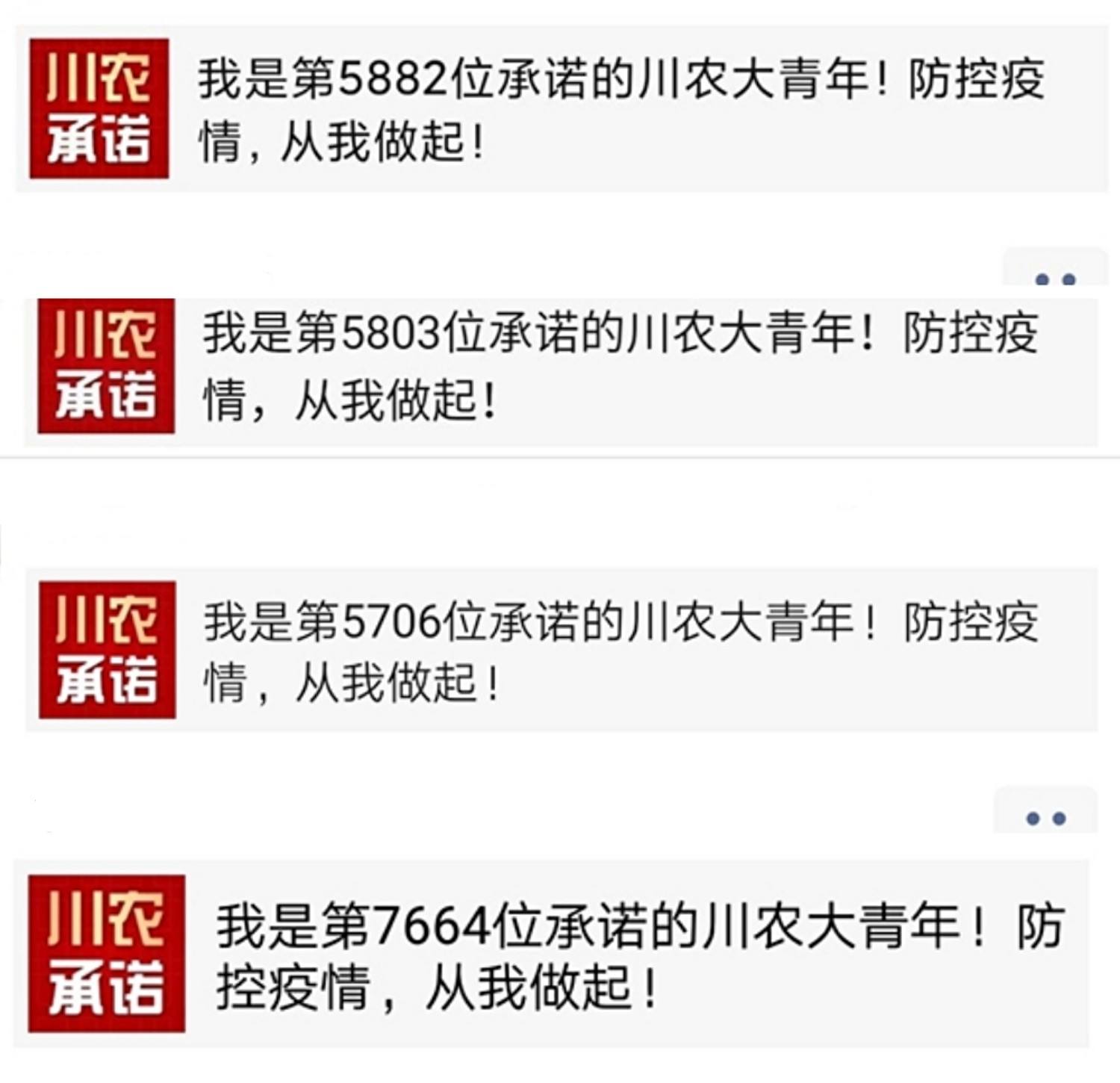 “自1月30号以来至今,我就义无反顾地参与到四川省成都市郫都区郫筒街道书院社区疫情排查及防疫宣传志愿工作,投身社区第一线。”参与社区防疫志愿者李明潞激动地分享着自己的志愿经历,“几乎每天都需要负责对小区业主情况进行统计及回访、返郫人员登记、防疫宣传督查、疫情期间商铺复工审核和为湖北居家隔离业主提供生活用品等繁琐的工作,但我乐在其中,我知道这是应当肩负的责任。”星星之火,可以燎原。同学们充分借助微信等网络载体,以接龙承诺签名的形式,自觉签署防控疫情期间川农大青年的一份承诺带头遵守学校和所在地关于疫情防控的各项规定,同时还为疫情书写自己的心声、绘画独特的中国力量。这无一不彰显出当代川农学子的责任与担当。