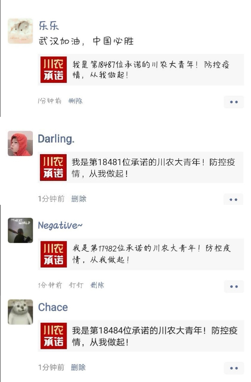 小班全体同学自觉签署在防疫期间的川农大青年承诺书,自觉遵守学校和当地政府规定,并以“转发到朋友圈”的形式彰显担当与决心。在防疫期间,小班同学并没有虚度光阴,而是以昂扬饱满的热情积极面对生活。其中王璐然同学为大家分享了自己的日常生活:在假期娱乐的同时,看书、学习一样也没落下。同时小班同学还为疫情献上自己的各类作品,贡献自己的绵薄之力。
