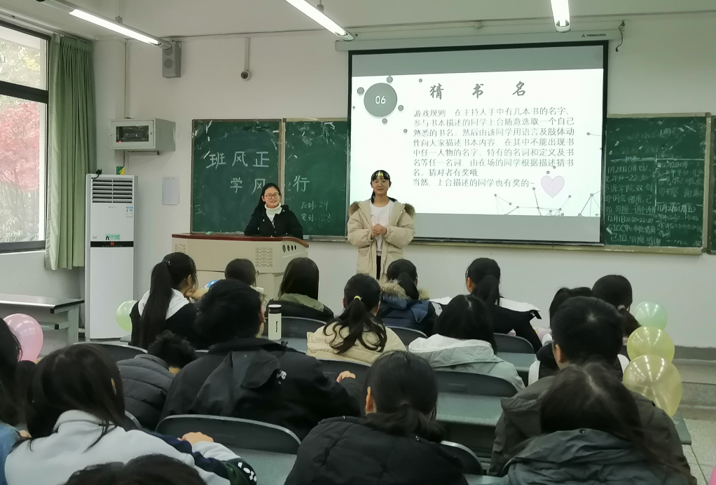 在“猜书名”小游戏环节,同学们上台领取题目、并通过描述情节来让台下的同学们猜取书名。杨致远、周明慧、怀坝等同学还主动上台为大家分享自己喜欢的书目。