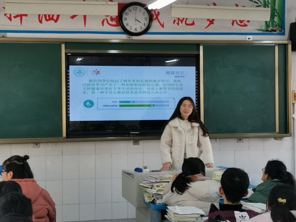 《爱上川农》宣传片拉开了宣讲活动的序幕。小分队通过对川农历史源流、校园文化的介绍,让母校学子激起对川农的无限向往。同时,通过对川农优秀人物的介绍来勉励学弟学妹们认真学习,把握时间,向着自己的梦想前进,去追逐属于自己的梦与远方。在分享高考复习经验环节中,小队队员们针对自身经验,并结合班级的具体情况,以“努力”、“坚持”为关键词,联系实际事例来激励同学们。同时对高考各学科展开考情分析,以实际行动助力高考冲刺。