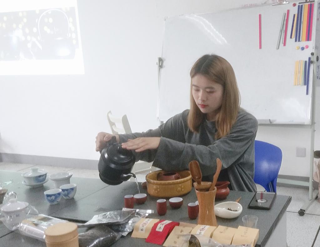 全体成员齐唱团歌后,活动拉开序幕。活动伊始,负责人为大家简要介绍六大茶类后,小班的两位茶会成员带来了赏心悦目的茶艺表演。在表演者行云流水般的表演和对茶背后的故事的有声讲解中,为同学们展示了茶艺之美。同时,同学们在对竹叶青、祁门红茶、铁观音、白牡丹、熟普、蒙顶黄芽等各类茗茶的赏茶、品茗、闻香中,感受到了茶的独特韵味、幽幽香气;也在交流分享中增进了同学情谊和班级凝聚力。为使同学们充分体验茶艺之美、茶汤之香,茶艺表演、赏茶品茗贯穿整个团日活动,营造了浓厚的品茶、学茶氛围。