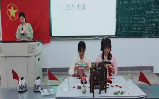 边金霖为同学们系统讲述了红茶品鉴的相关知识。她首先介绍了茶、红茶的定义,接着详细的讲述了生活品鉴四步法,即一捏,二嗅,三看和四多品。为了更好的感受时间带给红茶甘甜醇香滋味,在红茶品鉴案例分享环节中,特别邀请本班同学王若颜和廖思雨用双人对称红茶茶艺表演的形式分别冲泡滇红和祁红。在悠远绵长的音乐声中,唐岚讲述的红茶文化发展历史与革命先烈的故事在冲泡的茶水间回现。期间,同学们分别品饮了滇红和祁红两款茶,并对这两种茶的感受做了分享交流。边金霖也细致的区分了两款茶叶的不同之处,给同学们补充了很多专业干货。并赠予同学们茶叶,希望茶学专业的同学都应该亲近茶,爱上茶,让茶走进到大家的生活中去。