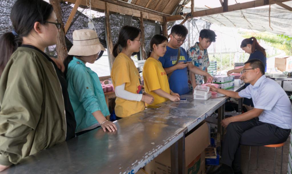随后几日,团队离开驻扎四天的雨瑞蓝精灵家庭农场,开始对成都市双流县黄龙溪镇其他产业园区进行调研,计划针对水果种植以及农场经营模式等方面对农场老板进行一系列的采访询问并实地观察。第一个目的地明宇农场是一家种植葡萄的农场,以经营农家乐为主要业务,提供下地采摘葡萄以及葡萄就地销售等。团队针对葡萄种植以及农场经营模式等方面对该农场老板进行了采访询问。与雨瑞蓝精灵家庭农场不同的是,该农场主要是请专业人员进行指导,然后再由老板及其雇用的工人进行种植。此外,团队参观的一家名为“全民小镇”的农场令人称奇。这是一家真正意义上的“农业+旅游”的农场,同时也是成都农林科学院果蔬新品种新技术示范基地。进门处队员们便看到了一群工人在铺草地,一经询问才知道原来这片地是种植水果的,但是为了发展旅游,所以将农场打造成大片的草坪以便人游玩,里面还有几座小山丘也在铺设草坪。园区面积相当大,但在园区水果分布管理的相当好,不同品类的水果放在不同区域,且都以智慧农业的技术进行着数字化生产,井然有序。随着城市化不断深入,现在越来越多的城市居民想要“逃离城市”,而这种下地采摘得营销模式无疑是一种很好的体验。此外,除了这种吸引人亲自前来体验采摘的销售渠道,园区还针对大型超市供货并设置网络上的销售渠道。