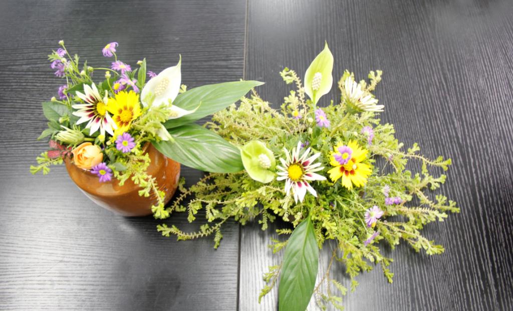 在听完讲座后表示受益匪浅的同学们,在老师的指导下进行实际操作,活动成员以血型为条件进行自由组队,通过修剪花枝、组合不同种类花束等操作,在规定的时间内完成了《微笑百态》、《野》、《春天》等植物造景作品,将理论与实践相结合,亲身体验“园艺疗法”带来的心灵治愈。其中,作品《放飞》的制作者选用白掌搭配淡雅的姬小菊,以清爽的绿叶进行点缀,一对白色的千纸鹤让作品更加生动。