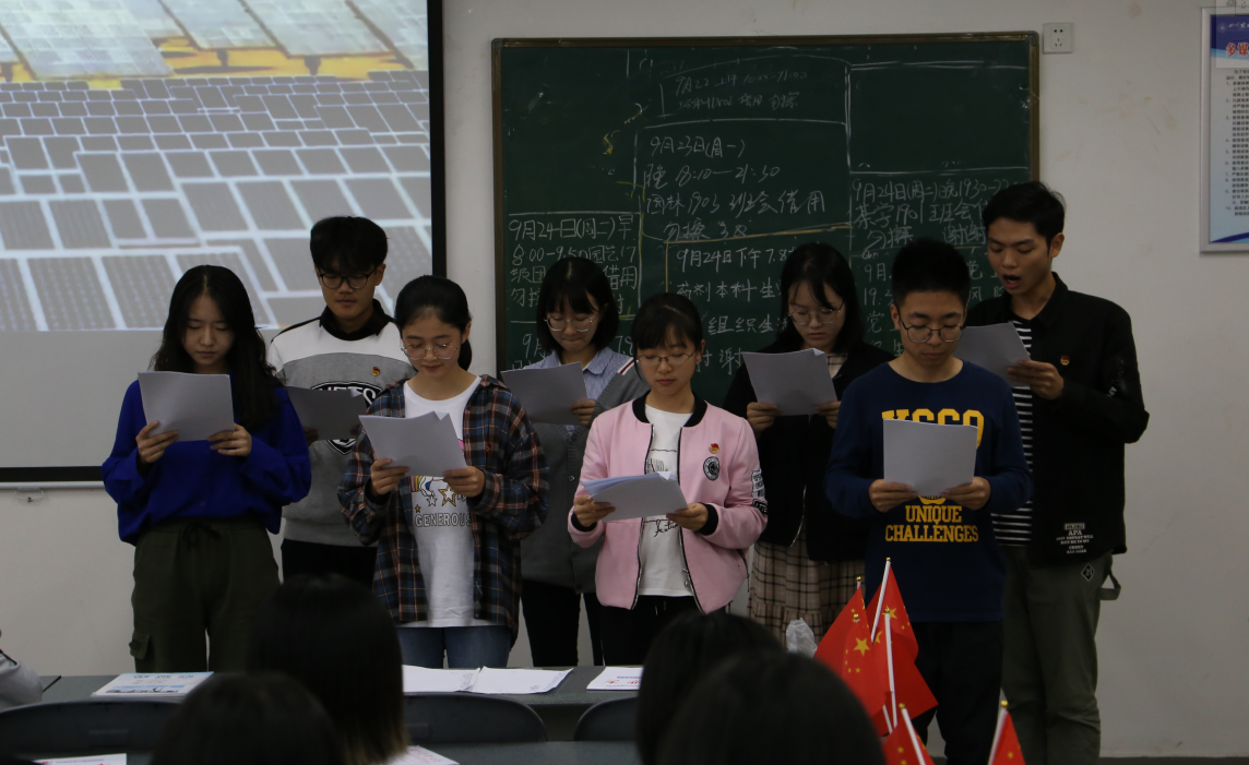 随后,八位诗歌朗诵者共同朗诵诗歌《你脚下的这片热土》,带来了强国之声朗诵,青年们用自信坚定、感情饱满的赞颂,诉说着祖国的崛起与腾飞。“厉害了,我的国!”短短一句话,是一代又一代中国人的不懈拼搏,更是吾辈奋发向上的坚定决心激烈昂扬的口号、热血高涨的发言让支部成员了解到了过去七十年的风雨斗争。