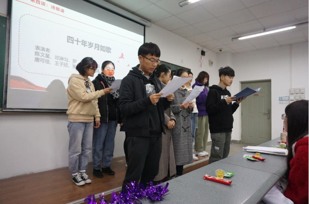 “我们是五月的花海,用青春拥抱时代;我们是初升的太阳,用生命点燃未来......”伴着全体支部成员激情嘹亮的歌声,此次活动拉开了序幕。通过生动的ppt讲解、精彩的诗朗诵等多样形式,同学们一起回顾了40年改革开放的风雨征程与辉煌成就。