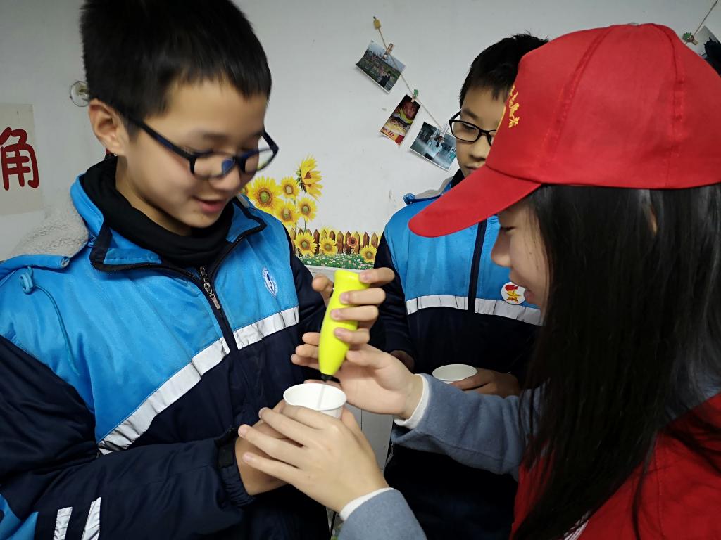 “千呼万唤始出来”,同学们期待已久三色红茶及奶茶的制作开始了。在志愿者对茶饮的调制方法进行详细的讲解之后,同学们便在志愿者的辅助下亲自动手制作三色红茶。调茶才刚刚开始,孩子们便被志愿者手中小小的打泡器吸引力了眼球,当志愿者问到:“有没有同学想来试试打奶泡呀?”他们争先恐后地举起手,在教室里排起了整齐的队伍,在志愿者的悉心指导下,打泡器震动起来,教室里弥漫着鲜奶的香味。一番学习过后,各式奶茶新鲜出炉,同学们请他人品尝着自己做的茶饮,相互评价茶的味道,在分享自己亲手制作的奶茶中,活动步入尾声。