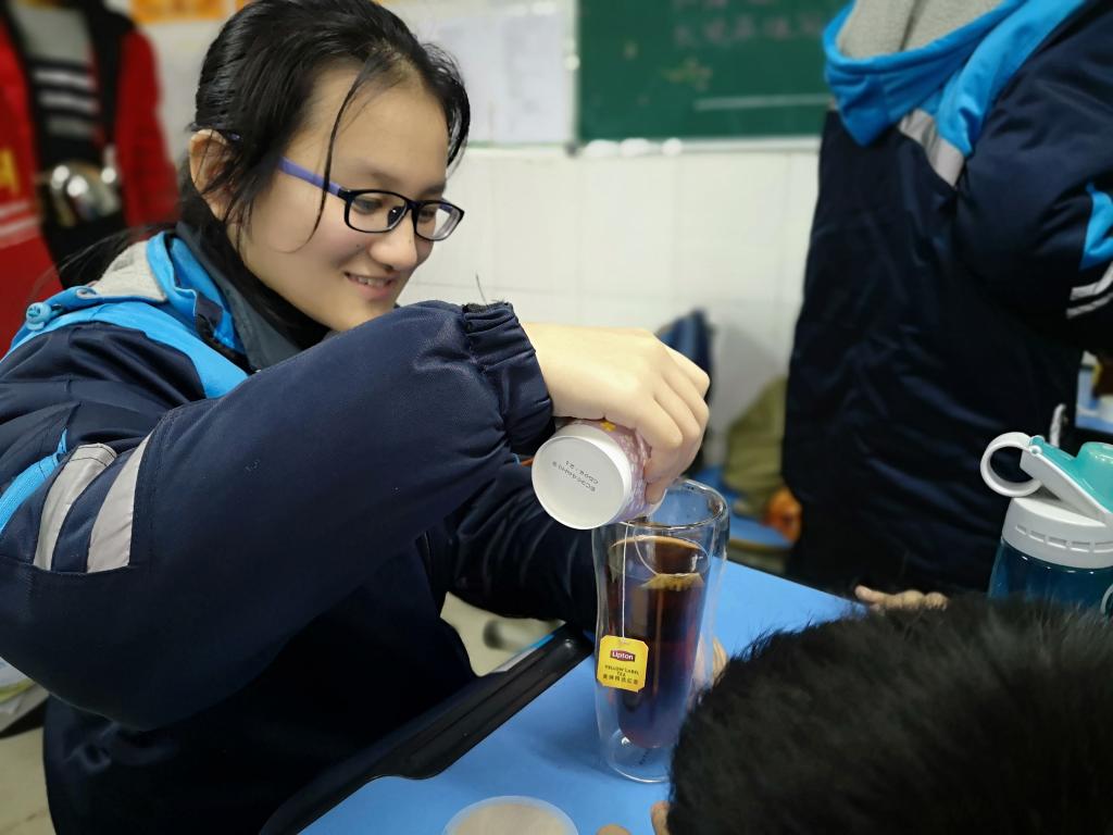 活动伊始,志愿者在一旁准备好调茶所需物品,随后便从茶的起源、分类、应用三个方面讲解茶文化。志愿者在与同学们的交流中发现大家都有喝奶茶的习惯,“我喜欢乌龙茶。”“蜜桃茶好喝。”“还有绿茶,十分清香。”同学们争先恐后地回答到。