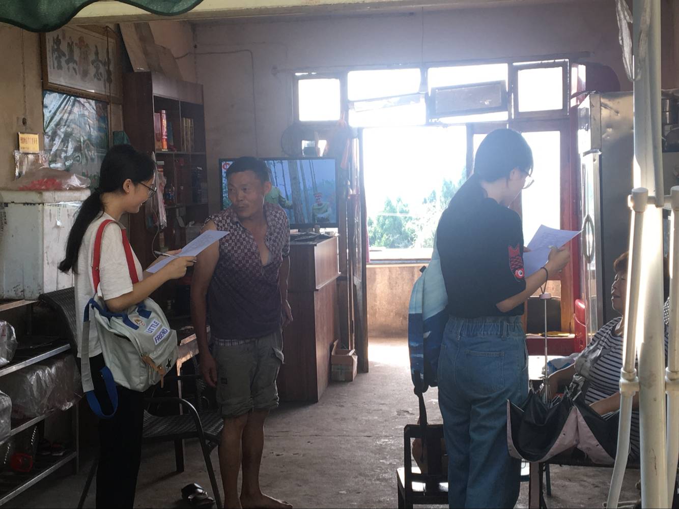 进入村落之后可以看到三三两两的游客和一些摊主。队员开始礼貌的进行采访,询问当地人一些地方垃圾治理的问题,询问游客对这里环境的印象。采访到的一个叔叔很自豪的对这群老员工说:“我们这里的人都很自觉噢,从来不会乱丢,每个人都会很自觉的去维护。也有专门的公司负责定期去集中点回收垃圾,巴适得很。”