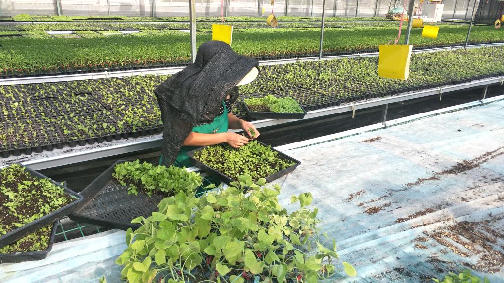 据团队成员前期了解,两大公司的不同之处在于种植的作物不同,分别侧重于瓜果与花卉的种植。对于团队成员的到来,负责领队的两名公司技术人员表示了热烈的欢迎。随后一行人便展开对公司的参观实习,领队者每逢一处种植区都会对成员们进行相关产品和技术的讲解。他们不时地抛出一些专业性问题,团队成员积极抒发各自的想法。参观过程中,不少工人正在进行着种苗的筛选与扦插,大型现代化设备如生产机床、喷灌车、智控系统等正在有条不紊地运行。