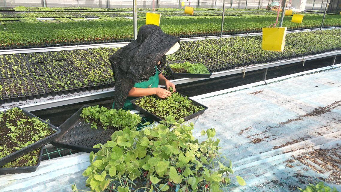 据悉,一座独立的大棚占地2220平方米,即传统意义上三亩地,但大棚内作物产量却远超传统种植的三亩。瓜苗的种苗培育需要工人进行扦插操作保证种苗的优良生长。在温室内部,不停转动的排风扇控制了棚内的温度适宜,黄色的捕虫纸利用了昆虫趋黄性使其粘附。这些简单的措施都足以保证瓜苗生长的环境适宜。据刘师兄所言,花卉与瓜果不同,前者的培养更为简单,不但免去扦插这一工序,且花卉的生长周期要短于瓜果。产业化育苗花卉靠量,而瓜果更多的是靠质。