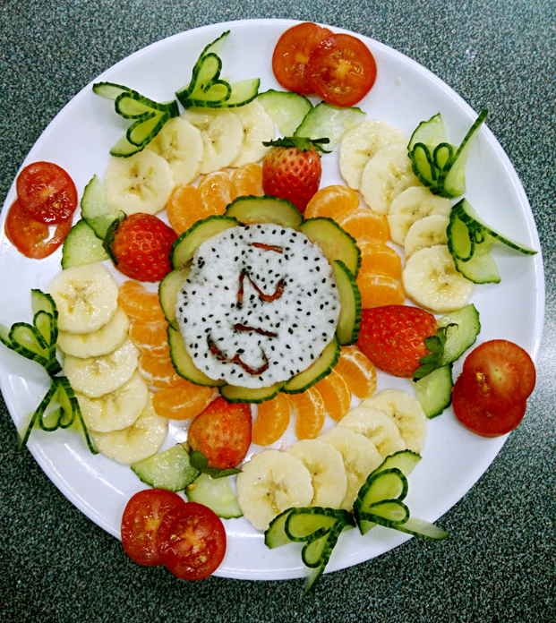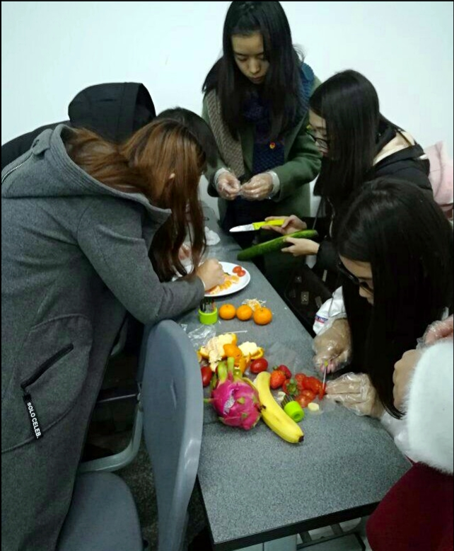 员工自己动手制作的果蔬拼盘教学视频拉开了果蔬拼盘创意制作环节的序幕。对于正在学习园艺产品商品化处理的同学们,这个环节无疑是一场“及时雨”,让他们在实践中躬行求真知。普通的香蕉、草莓、火龙果、圣女果,一条条的黄瓜丝,一片片的香蕉片,一瓣瓣的黄金橘,在他们的手下,俨然成了一幅幅美丽的画卷。“这个环节不仅考验创意点子,还考验团结协作能力,更考验刀工、审美。赵海清同学说道:“其中一组的拼盘令我印象深刻,久久不能平静。那幅送给南京大屠杀里遭受不幸同胞的《永不凋零之花》。”