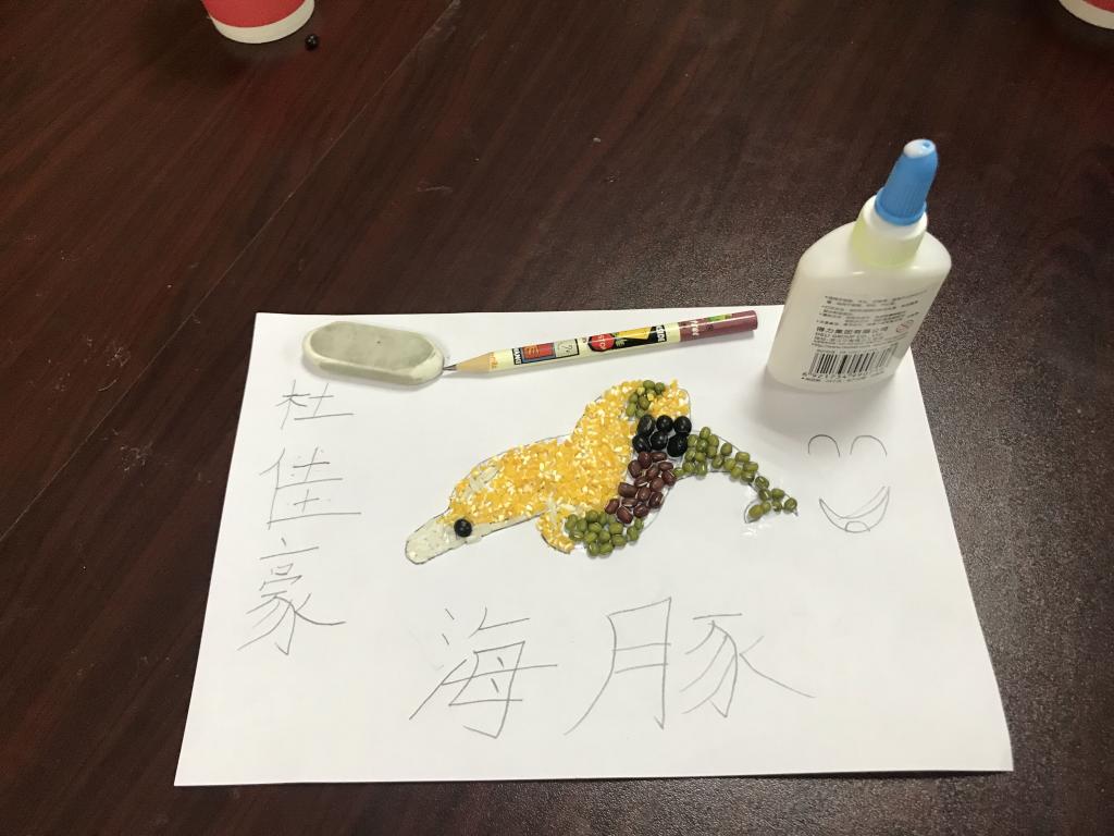 平日里默默地出现在菜肴中的各种豆类被同学们的想象力赋予了艺术的气息,同学们的画作也因为豆豆的点缀得以升华。最终,海豚披上了金黄色的外衣,恐龙装上了五颜六色的盔甲,踏在绿油油的草坪上,这些栩栩如生的画作是同学们丰富内心世界的展现,是对艺术来源于生活的诠释。