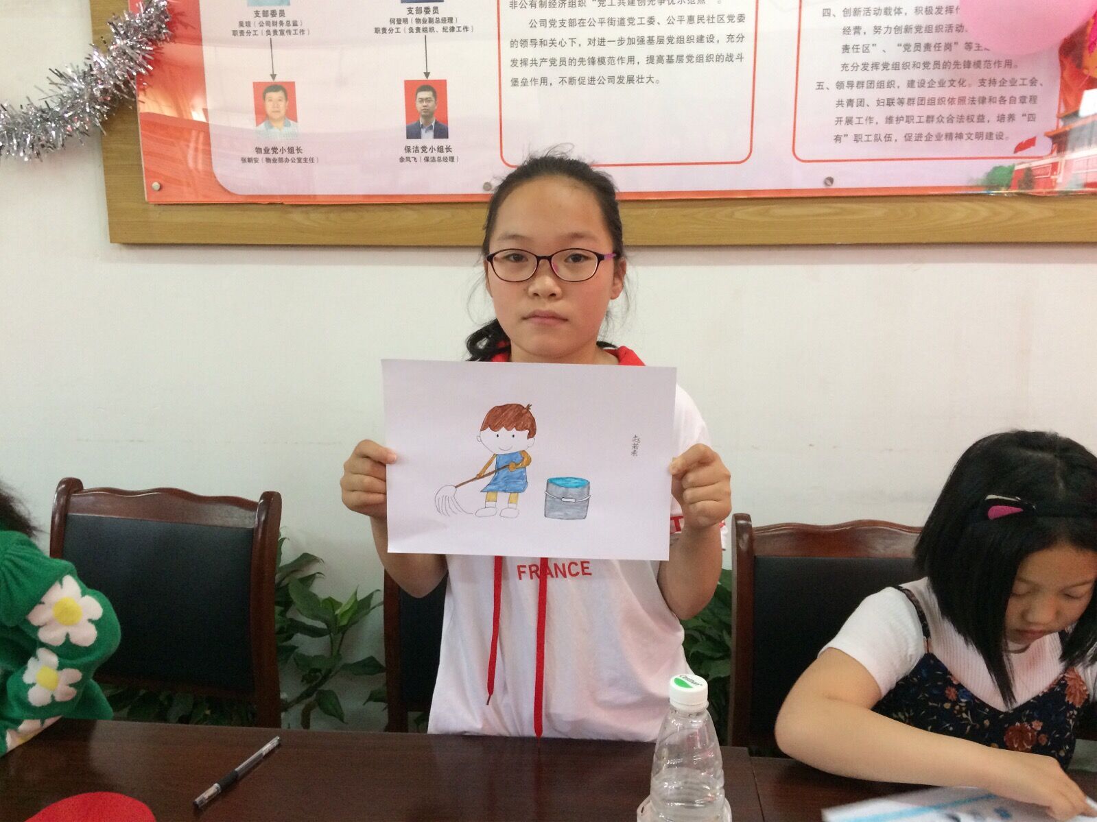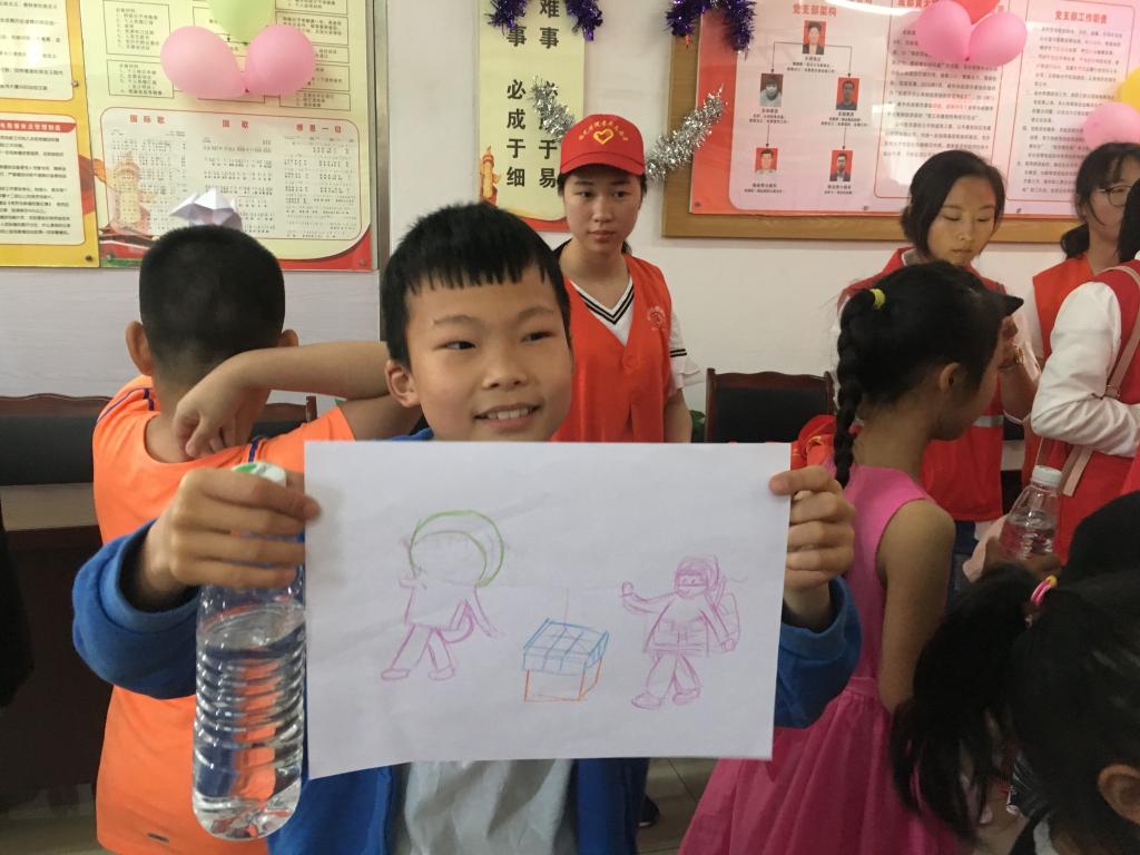 随后,孩子们纷纷拿起了画笔,笔尖在纸上肆意飞舞,一个小女孩把一幅春意盎然,树下有个女孩在洗衣服的画拿到志愿者身边,说:姐姐,你能不能帮我写‘我自己洗裙子’,大家都投来了欣赏的目光。孩子们的作品里,有在拖地的母亲、有在大扫除的同学、有在耕作的农民伯伯。