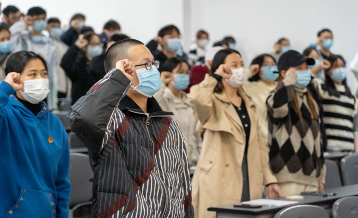“党的二十大精神”专题学习会环节,主持人先是介绍了党的二十大召开背景、主要内容与意义以及青年如何奋斗。由浅入深,由宏观到微观,让大家充分认识到当代青年所肩负的时代责任。希望大家要传承红色基因,认真学习领会党的二十大精神,将其入脑、入行,用新思想指导自己的实践,为建设社会主义现代化国家不懈奋斗、不断贡献青春力量。随后,合唱团带来了激情演奏,歌声雄厚、乐声高扬,教室的氛围变得庄严肃穆,大家被歌声感动。当演奏结束,全体同学起立向团旗宣誓:“坚决拥护中国共产党的领导,遵守团的章程,执行团的决议,履行团员义务,严守团的纪律,勤奋学习,积极工作,吃苦在前,享受在后,为共产主义事业而奋斗”、“请党放心 强国有我”。每个字都铿锵有力,不只在于口头更在于行动,它将贯穿大家的一生。在考察同学们对党的二十大精神学习知识竞答环节,活动负责人精心准备了题目,同学们踊跃抢答,融学习于活动,同学们还将学习心得与大家分享。