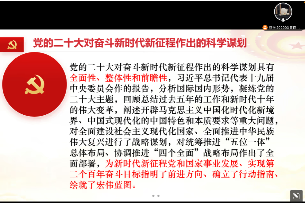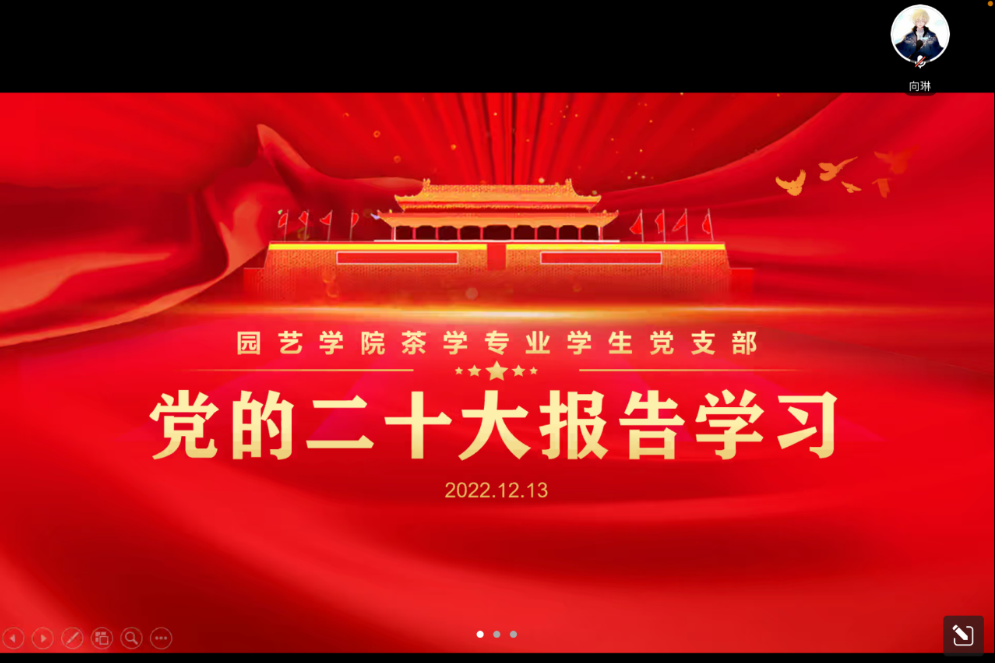 12月13日下午,茶学专业员工党支部全体同志线上学习了党的二十大科学谋划的重大意义相关内容。深入了解了党的二十大站在新时代新征程的历史起点上,对中国未来五年乃至更长时间的发展作出的科学谋划,对党带领人民为全面建设社会主义现代化国家、全面推进中华民族伟大复兴而团结奋斗的指导意义。