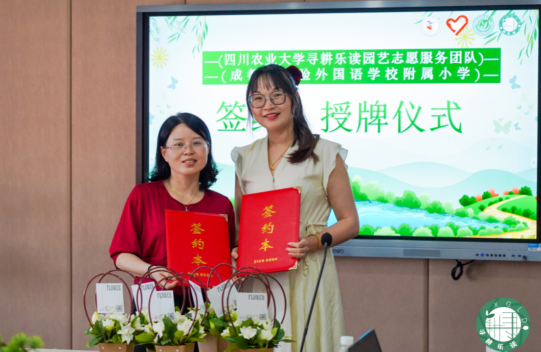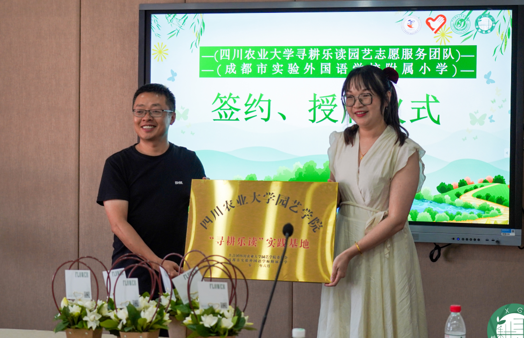6月9日,学院“寻耕乐读”志愿服务团队实践基地落户成都市实验外国语学校附属小学签约仪式举行。成都市实验外国语学校附属小学副董事长郑燕红,董事长助理罗志飞,实外附小劳动实践课程负责教师李邹丽,公司党委办公室副主任、团委副书记李瑜和“寻耕乐读”志愿服务团队部分成员以及该校师生代表参加仪式。