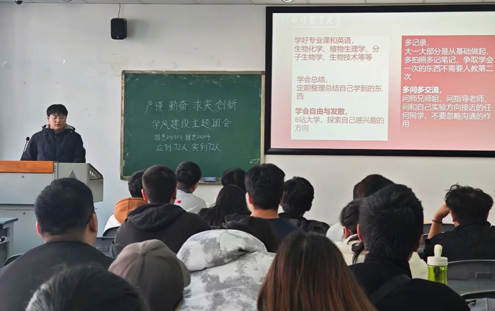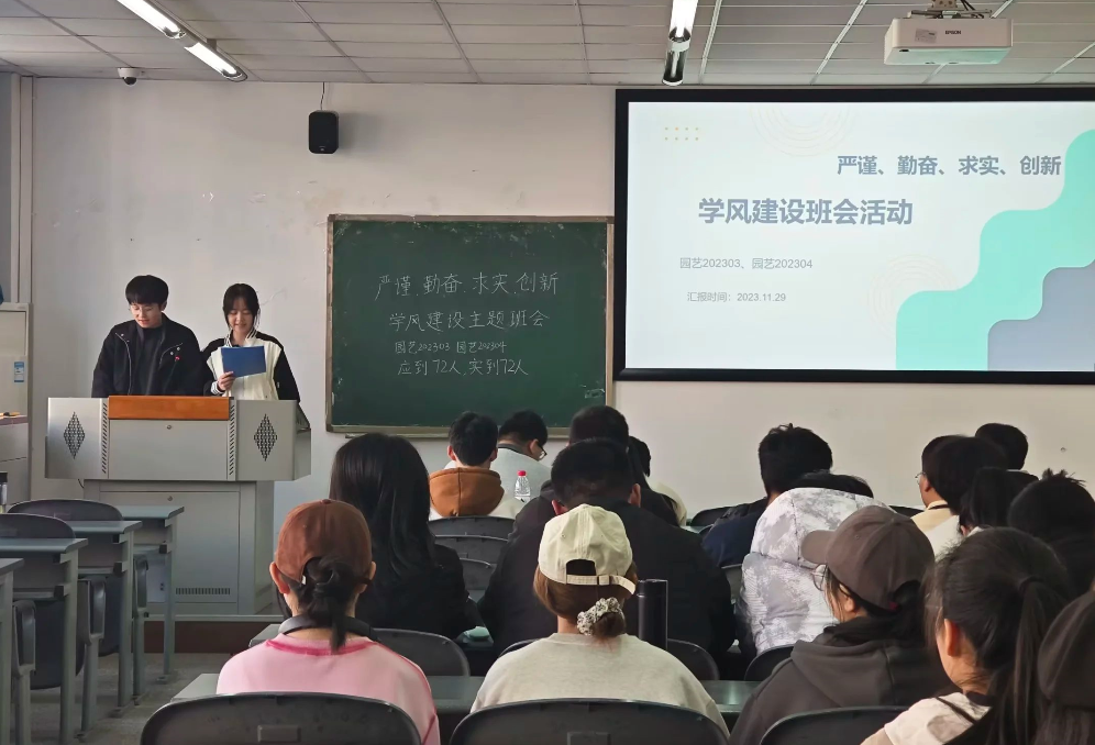 为营建优良学风,园艺202302班联合茶学202302班及茶学202303班共同举办以“扬求是新风,树学风新貌“为主题的学风建设主题班会,同学们阅读材料并进行“学风知识建设问答“抢答,在这一环节中,同学们充分了解了学风最本质最核心的内涵以及学风建设的重要意义。园艺202101班、园艺202102班、园艺202104班分别总结了过去一学期内小班的学习成绩和学风情况,并进行了综合素质能力分析,主要从英语四六级过级情况、普通话水平测试、计算机二级证书等各类证书考取情况、三大赛事和科研兴趣项目三方面来分析,针对21级准备考研保研同学,要提高自己的必修加权成绩和创新创业成绩,并邀请了已成功保送研究生的茶学20级员工罗秋宇和园艺20级孙悦、何浩等同学给大家进行保研分享。
