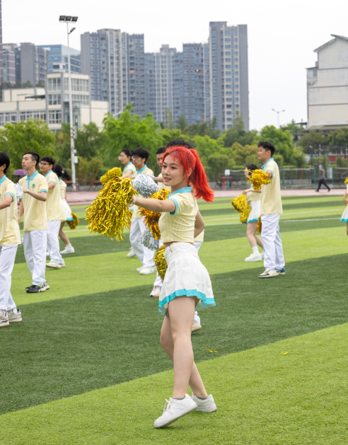 开幕式后,备受瞩目的健美操比赛闪亮登场。队员们穿着统一的服装,金银两色的花球更为节目增添一份活力。经过了数个晚课后的辛苦训练,同学们没有辜负自己的努力,在绿茵操场随着“踩踩踩”的音乐轻快舞动,让整个校园的氛围变得欢快起来。音乐结束的刹那,大家定格在最后一个动作,脸上洋溢着热情的笑容,学院的青春活力在这一刻展现的淋漓尽致。