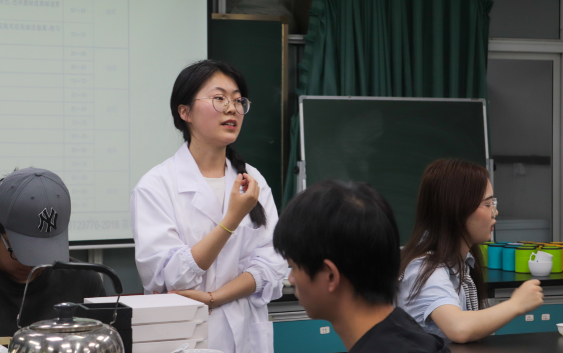 茶学研究生王瑗媛在品鉴会的开始为大家讲解并演示了茶叶的审评方法,保证后续的每一组审评能够顺利进行,也让同学们学到了专业相关的技能。此次品鉴会主要从汤色、香气、滋味、叶底四方面去审评了甘露、龙井、雀舌等绿茶。