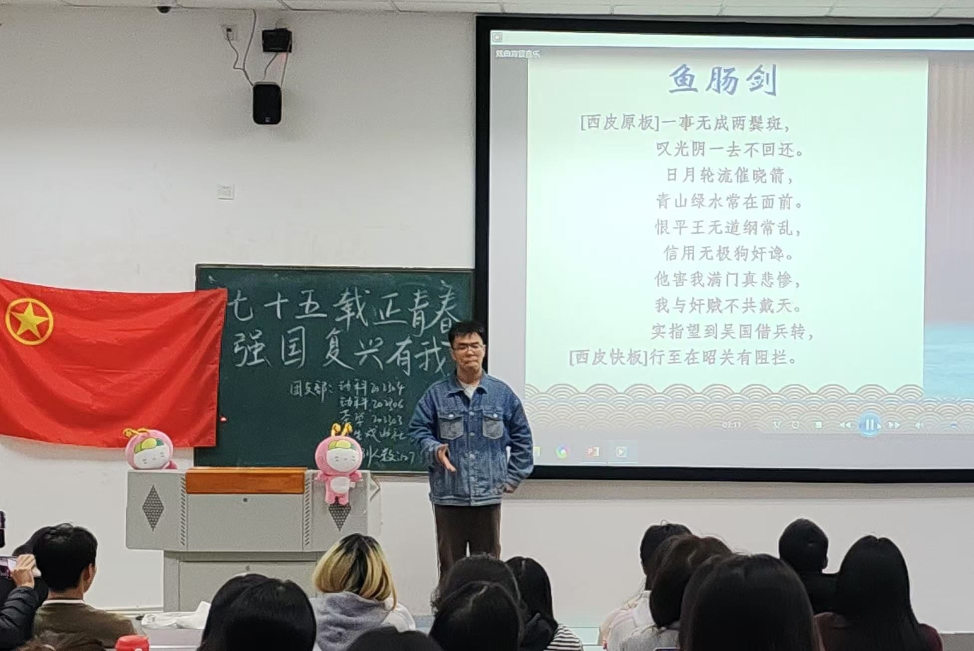 本次班团活动共有八项内容。齐唱团歌结束后,开展了一系列75周年主题宣讲;活动首先阐述了习近平总书记发表的重要讲话,随后总结了中国式现代化的来时路,最后以一首《予家予国》MV收尾,带领同学们见证了75周年的变迁;接着戏曲社进行传统非遗文化戏曲表演,展示中华优秀传统文化的魅力;“青年追勋学志”主题引出为新中国建设和发展作出杰出贡献的功勋模范人物,首期“青马工程”西部计划专项班付艺阳同学就“庆祝中华人民共和国75周年”主题进行宣讲;活动还邀请到哈哈体育“寻耕乐读”团队进行团队实践分享,以榜样为荣,当代青年应以心质青春,奋楫挺膺担重任;在“习近平总书记讲述关于粮食安全问题”部分,采用问答形式,开展相关知识点的阐述,并在最后引入到本科教学评估板块,讲述学风建设和班风建设关键。