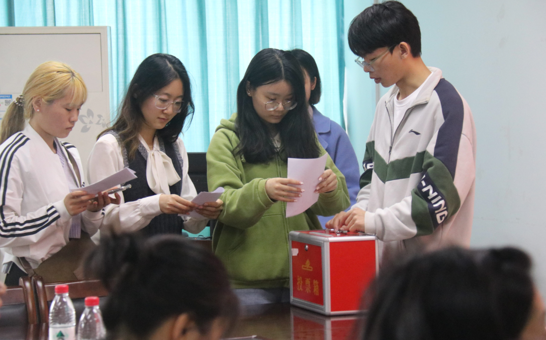 在各候选人陈述完毕后,按照选举程序,以无记名投票方式差额选举产生了蔡欣瑶、伍丽梅、马子涵、金鑫同学为学院第十六届团委员工会主席团成员。