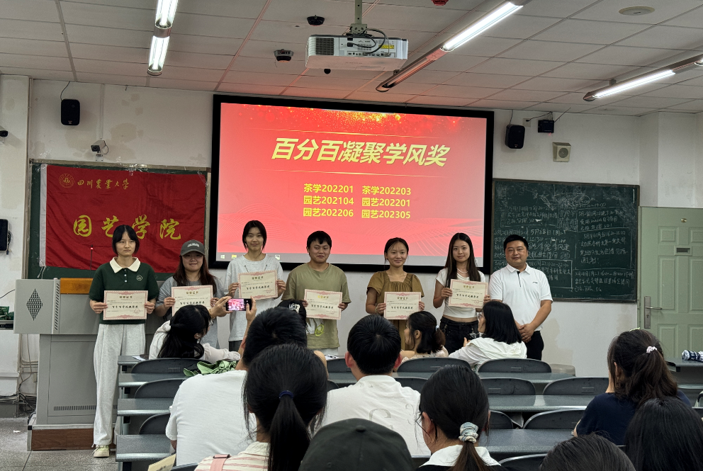王均对在学风建设之参与校运打卡活动中获得优秀的园艺202104、茶学202201等六个班级颁发了“百分百凝聚学风奖”。