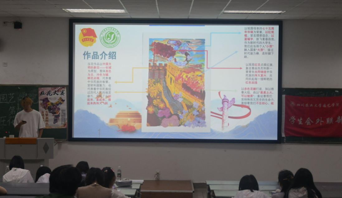 比赛以“青年梦‘园’新时代,盎然花艺献祖国”为主题,结合专业特色,通过压花形式展现新时代青年的风采,献礼中华人民共和国成立75周年。活动自比赛启动以来,成都校区各学院同学积极响应。初赛阶段,评审团根据作品与主题相关度、作品美观性以及是否按要求制作等方面进行评选,共评选出8件优秀作品进入决赛环节。
